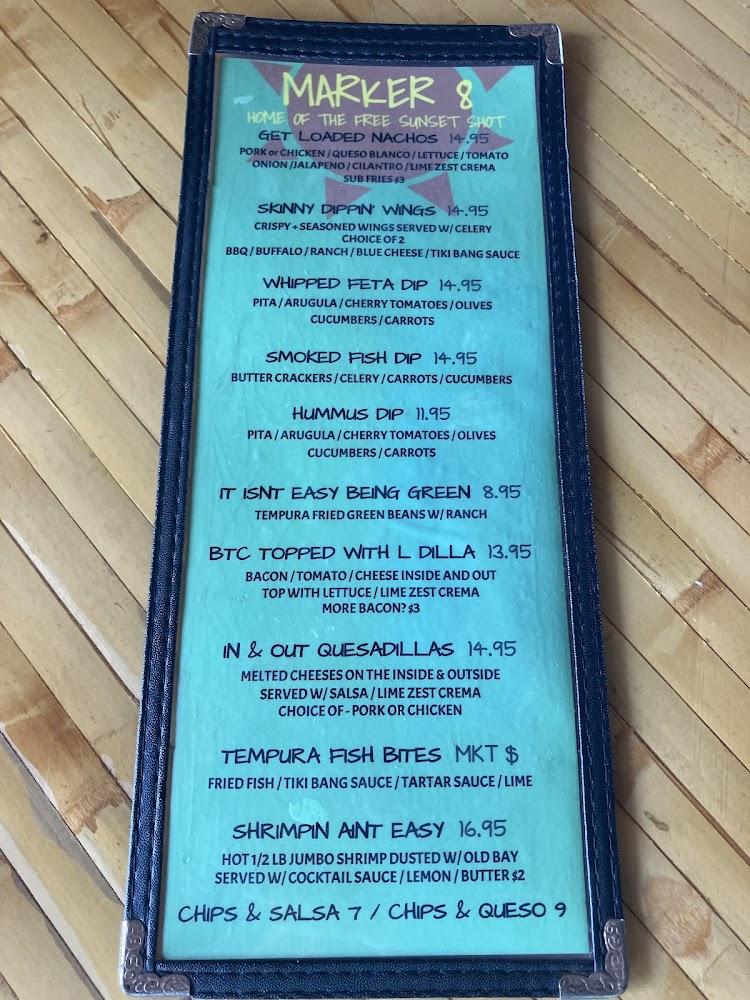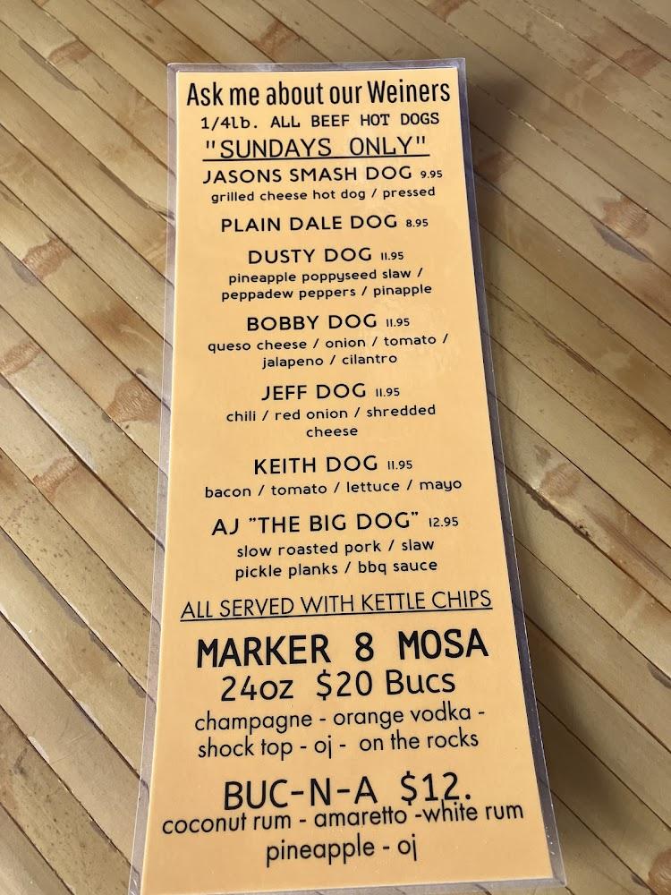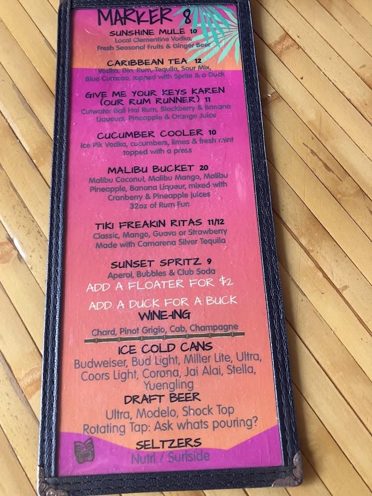 Welcome to Marker 8, your ultimate tiki bar destination right on the water in Dunedin, FL! Enjoy a relaxed atmosphere with stunning views and a vibrant ambiance. Our diverse menu features simple, traditional cuisine, excellent cocktails, and a wide selection of beers, perfect for a casual lunch, dinner, or a solo outing. Experience live music, sports, and fun cafe games while relishing our happy hour specials. We offer accessible seating, takeout, and delivery options for your convenience. Join us for unforgettable moments at Marker 8, where great food and good times await!